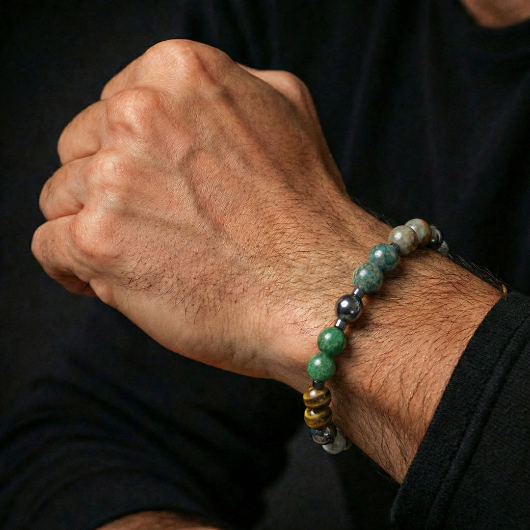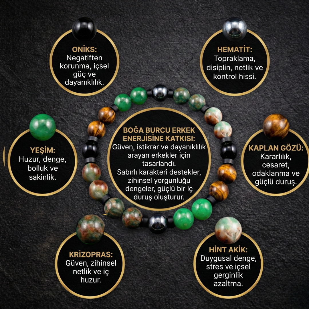 Boğa Burcu Erkek Bilekliği; güven, istikrar ve dayanıklılık arayan erkekler için tasarlandı. Taş kombinasyonu; sabırlı ve sağlam karakteri desteklerken, zihinsel yorgunluğu dengelemeye ve güçlü bir iç duruş oluşturmaya yardımcı olacak şekilde bir araya getirildi.