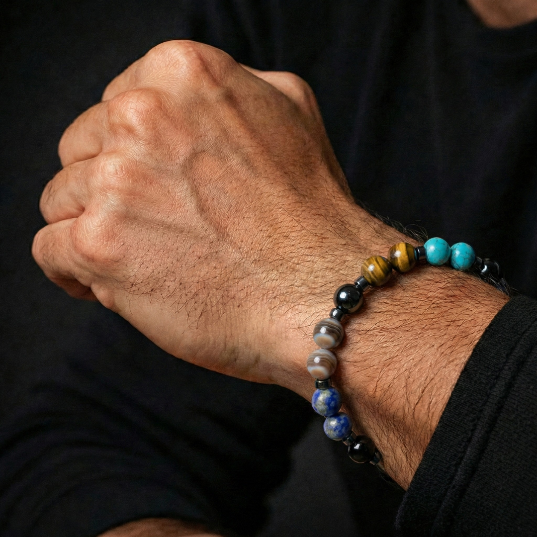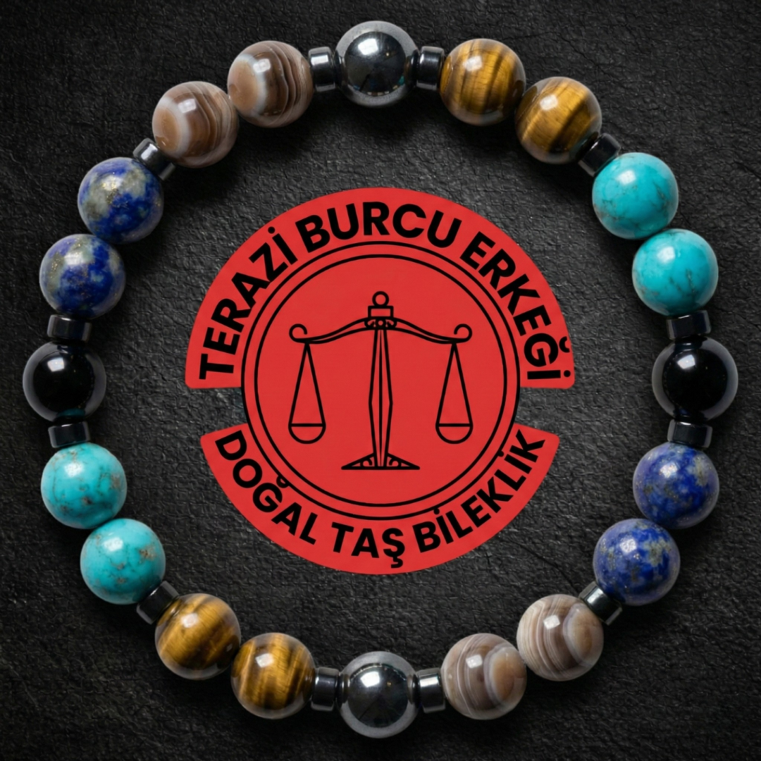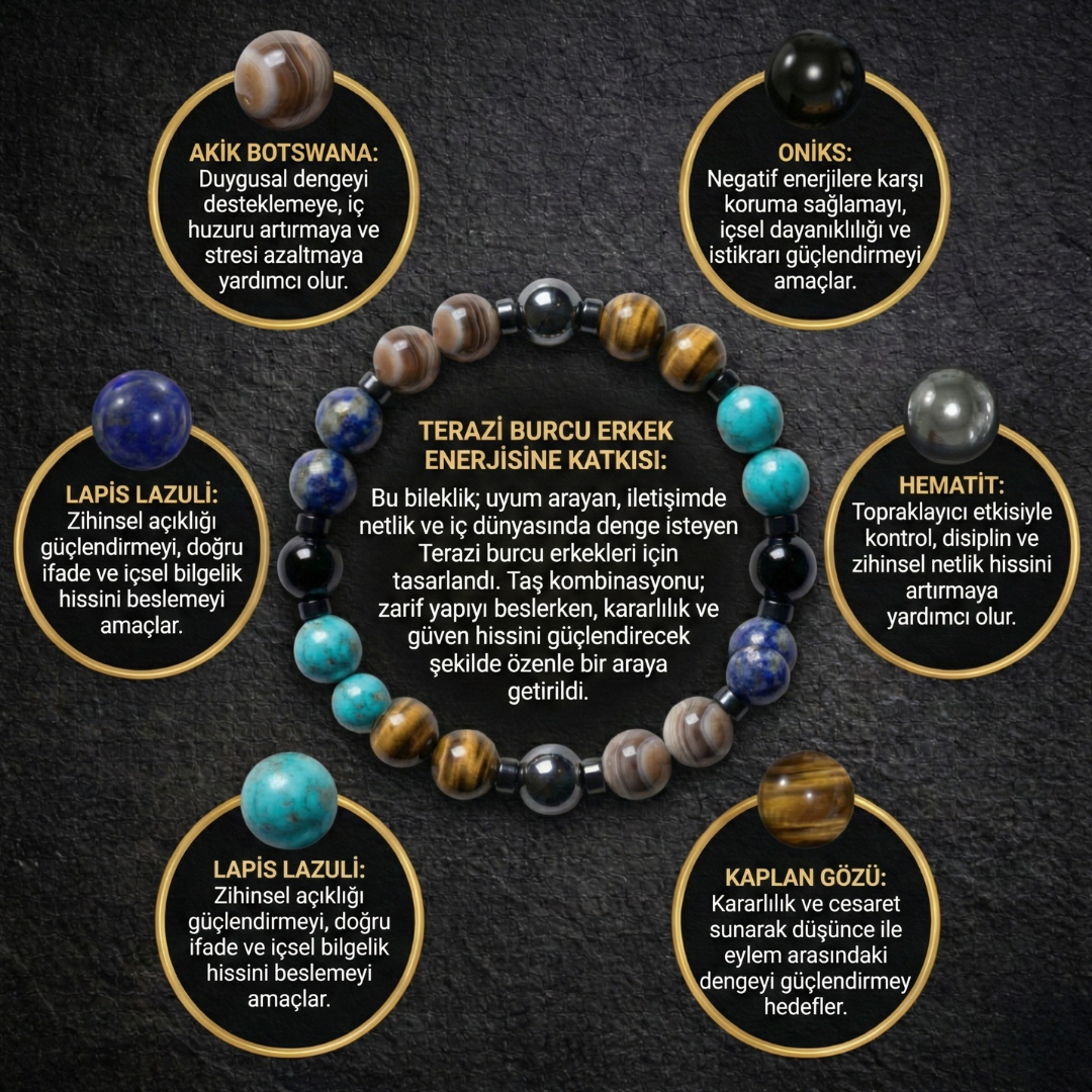 Bu bileklik; uyum arayan, iletişimde netlik ve iç dünyasında denge isteyen Terazi burcu erkekleri için tasarlandı. Taş kombinasyonu; zarif yapıyı beslerken, kararlılık ve güven hissini güçlendirecek şekilde özenle bir araya getirildi.