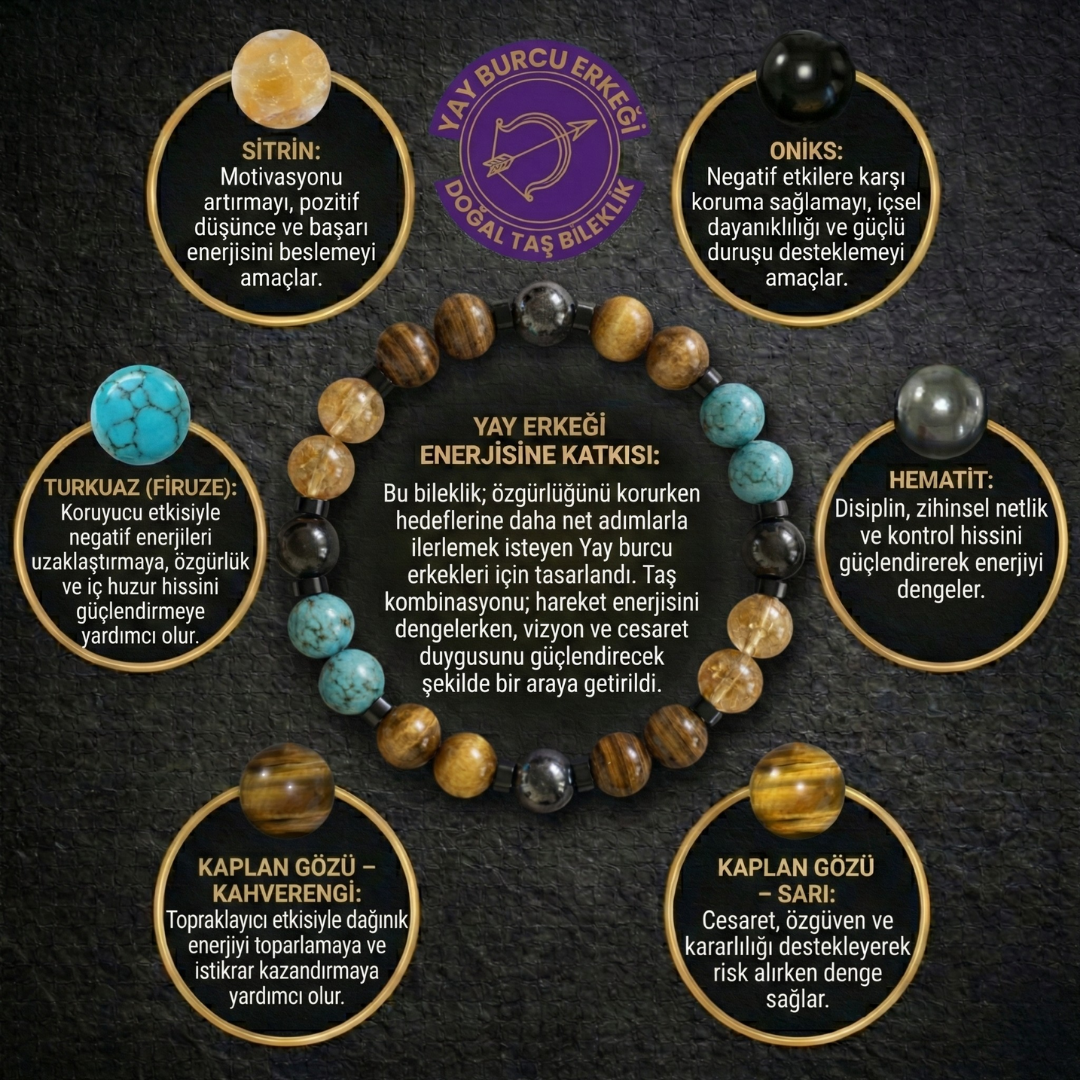 Bu bileklik; özgürlüğünü korurken hedeflerine daha net adımlarla ilerlemek isteyen Yay burcu erkekleri için tasarlandı. Taş kombinasyonu; hareket enerjisini dengelerken, vizyon ve cesaret duygusunu güçlendirecek şekilde bir araya getirildi.